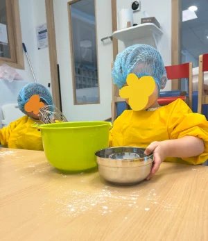 Dans la cuisine de la crèche de Montigny, les apprentis cuisiniers préparent ensemble leur goûter : verser les ingrédients, mélanger, observer la pâte se former — un atelier gourmand et sensoriel qui développe la coordination et l'éveil des tout-petits.