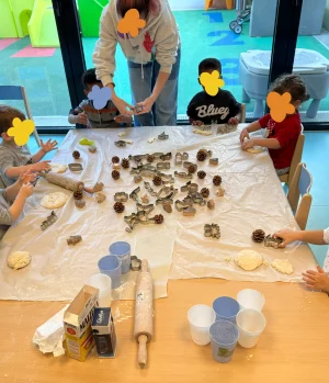 En automne, les jeunes curieux de la crèche de Montigny façonnent de la pâte à sel en forme de pommes de pin : malaxer, modeler, décorer — des gestes créatifs qui sollicitent la motricité fine et ouvrent les sens aux textures de la saison.