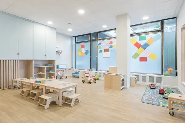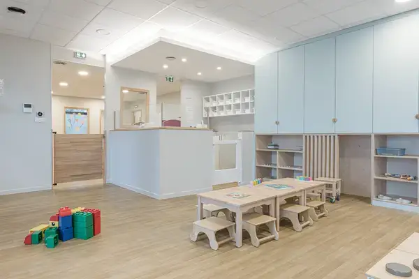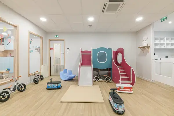 Ouverte en septembre 2024, cette crèche de Vincennes bénéficie de 186 m² intérieurs avec une salle de motricité dédiée — un espace spécifique pour les séances de parcours, de roulade et de jeux d'équilibre. Les 20 enfants accueillis évoluent dans des espaces intérieurs bien distincts : coin lecture avec albums illustrés et livres cartonnés, espace de motricité pour les activités physiques, coin doux pour les bébés en éveil. La crèche ne dispose pas d'espace extérieur propre, mais elle profite en proximité immédiate des allées calmes de la zone piétonne et du bois de Vincennes pour les sorties quotidiennes. L'ambiance intérieure mise sur la douceur : toboggan rouge, jeux de construction, figurines de ferme et animaux en bois constituent le fond de jeu proposé aux petits bouts. Susete, éducatrice de jeunes enfants et directrice, développe un projet pédagogique centré sur la découverte des émotions, l'expression corporelle et la vie en collectivité bienveillante. La crèche est ouverte de 8h00 à 19h00.