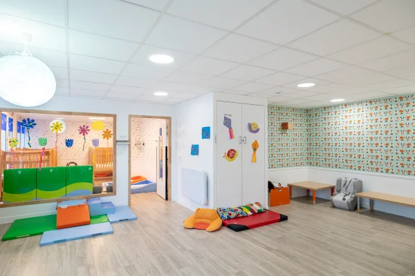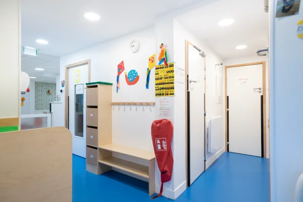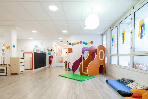 Sur 110 m² intérieurs, la crèche est organisée pour offrir à chaque bébé un espace d'exploration et de repos équilibré. Le toboggan coloré est l'un des équipements phares de la structure : les enfants adorent y développer leur motricité globale, leur équilibre et leur audace dans un cadre sécurisé. Des espaces de jeux libres et des coins repos confortables pour les siestes complètent l'aménagement.