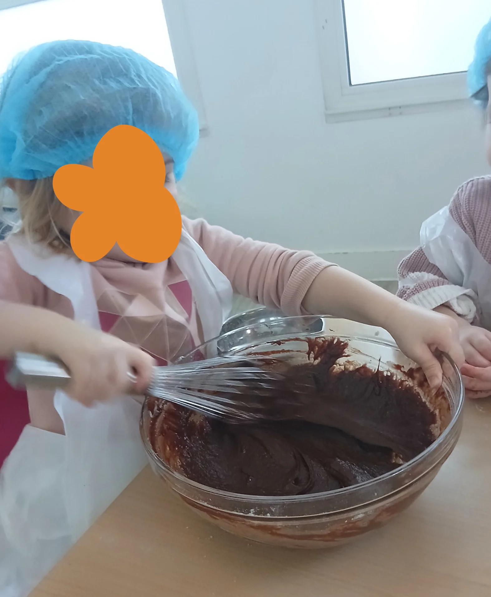 Charlotte sur la tête, fouet en main, nos petits cuisiniers s'affairent avec sérieux et gourmandise. Mélanger, sentir, goûter… l'atelier pâtisserie éveille les sens et nourrit la fierté de faire par soi-même.