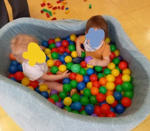La piscine à balles de la crèche de Grenoble réunit les tout-petits dans un espace de jeu libre et joyeux : plonger, attraper, lancer — chaque mouvement développe la coordination, la perception spatiale et le plaisir du mouvement.