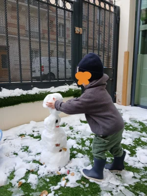 Dans le jardin de la micro-crèche de Levallois-Perret, un petit garçon construit un bonhomme de neige. Pétrir, modeler, assembler : ces activités Mome'Art en plein air renforcent la motricité globale et offrent aux explorateurs un contact direct et joyeux avec les saisons.