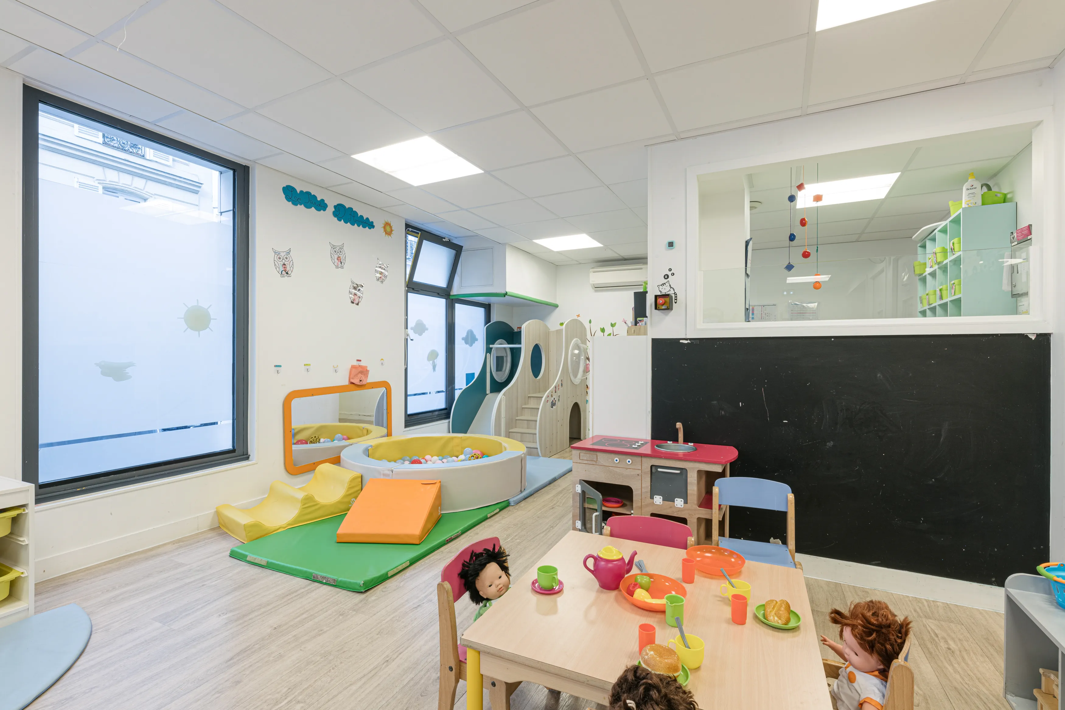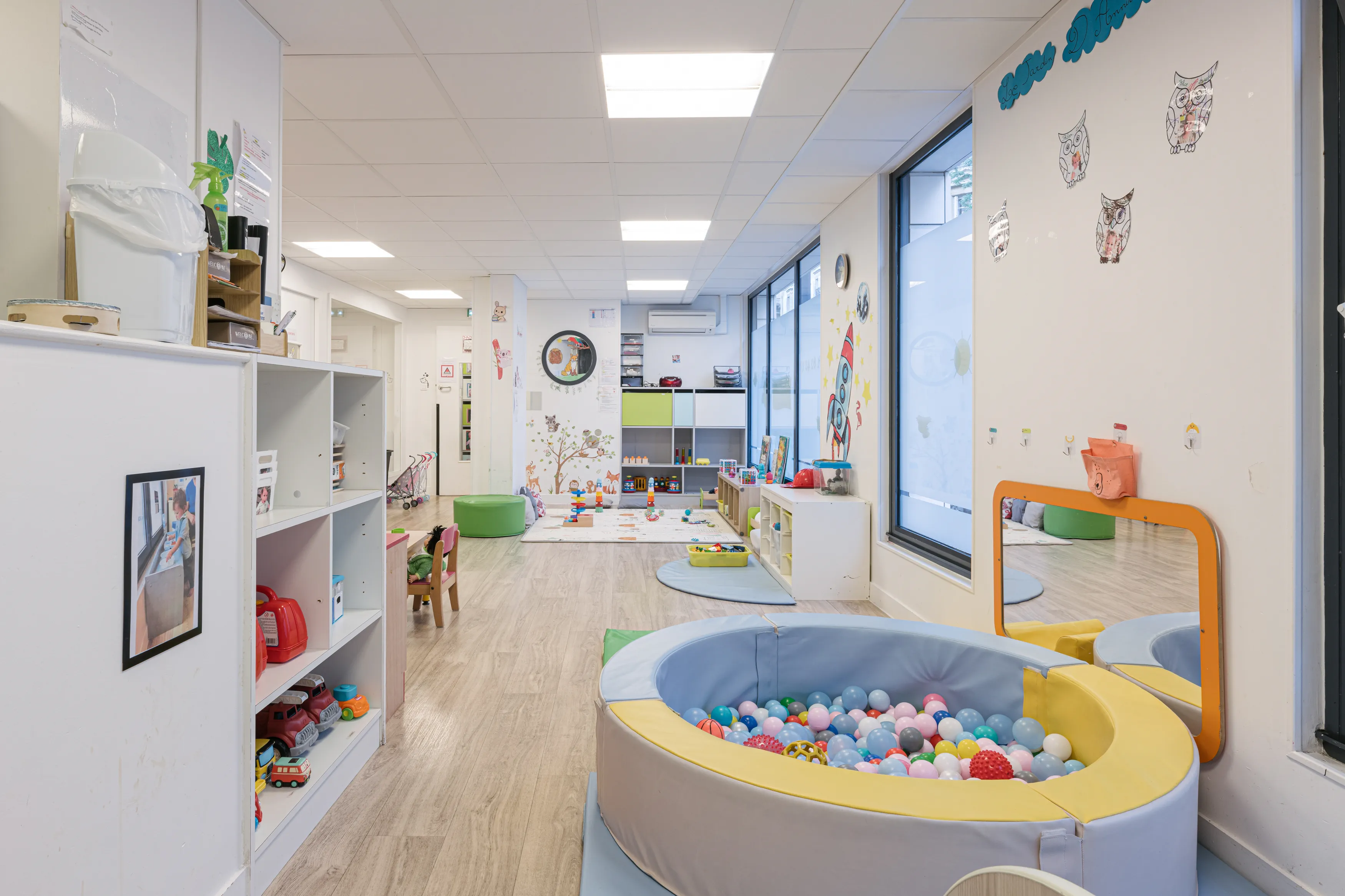 Sur 104 m², l'espace intérieur est conçu pour que chaque recoin soit une invitation à l'exploration. La fameuse piscine à balles est l'un des joyaux de la crèche : les tout-petits adorent s'y plonger, développant ainsi leur sens du toucher, leur équilibre et leur joie de vivre. La crèche se distingue également par son atmosphère lumineuse et colorée, qui stimule naturellement l'éveil visuel des bébés dès leurs premiers jours.