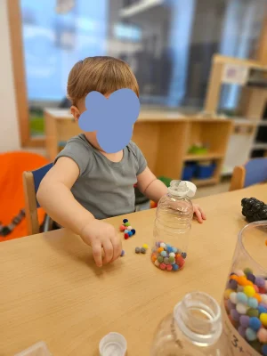 À la crèche du 16e, les enfants manipulent des billes colorées et les introduisent dans de petites bouteilles transparentes : un atelier sensoriel fascinant qui développe la concentration, la motricité fine et la perception des volumes.