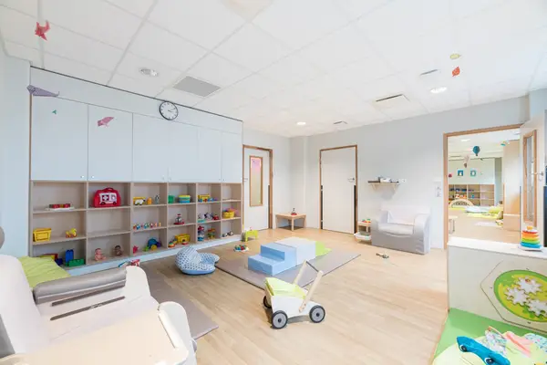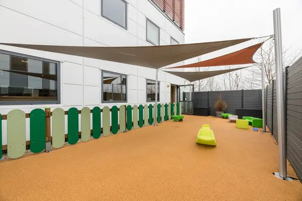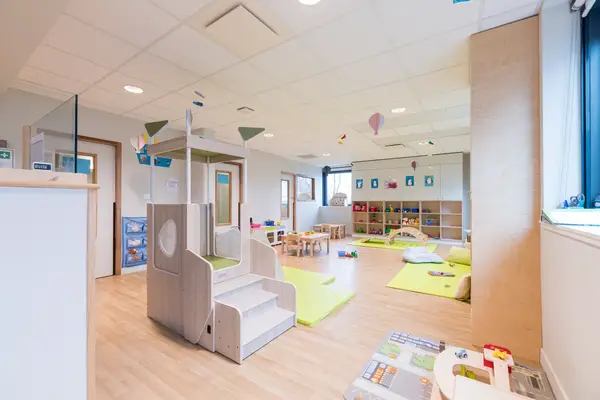 Avec ses 200 m² intérieurs et ses 50 m² de jardin, la micro-crèche de Saint-Herblain offre à 12 enfants de 2 mois et demi à 3 ans un espace de vie remarquablement généreux. Les pièces sont organisées pour favoriser à la fois l'éveil et la tranquillité : une zone de jeu animée avec structures à grimper, un coin bricolage avec seau de vis et écrous adaptés aux petites mains, et un espace calme réservé aux siestes.